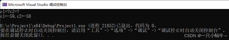 数字显示: 当使用%d来输出时,输出的值是变量c1和c2的整数表示。在有符号的char类型中,197被解释为-59,198被解释为-58,所以第二个printf语句输出的结果是c1=-59,c2=-58。