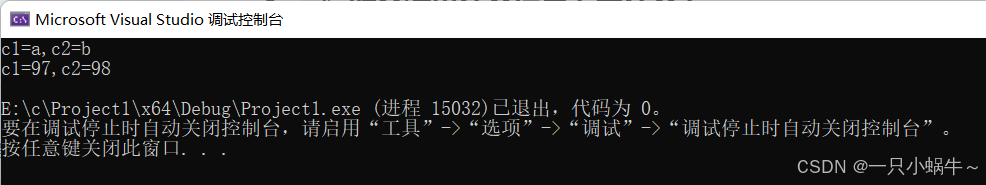 理由:首先,程序中定义了两个字符变量c1和c2,并分别给它们赋值为97和98。在ASCII码表中,97对应的字符是'a',98对应的字符是'b'。因此,当使用%c格式化输出时,会输出对应的字符,即 'a' 和 'b'。当使用%d格式化输出时,会输出字符的ASCII码值,即97和98。