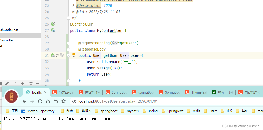 这个时候,前面两种情况分别对应了@DateTimeFormat(前端传入参数格式设置)和@JsonFormat(json序列化格式设置)注解的使用。
