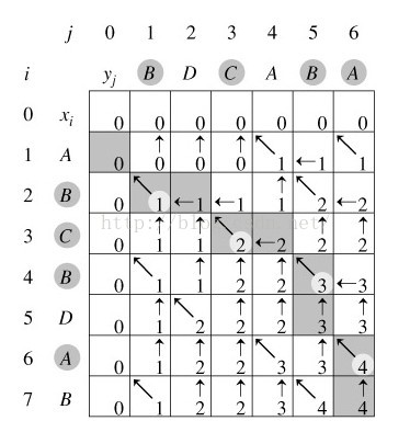 最大公共子序列,又称LCS,由于上课老师没有讲过,便自己学习了一下,这类问题一般描述为给定一定个字符串,求出个个串最长的公共子序列的长度,这种问题的解决思路很巧妙,用一个矩阵,行和列每个格子代表一个字符,分别表示出两个字符串,如图,引进一个二维数组c[][],用c[i][j]记录X[i]与Y[j] 的LCS 的长度,b[i][j]记录c[i][j]是通过哪一个子问题的值求得的,以决定搜索的方向。我们是自底向上进行递推计算,那么在计算c[i,j]之前,c[i-1][j-1],c[i-1][j]与c[i][j-1]均已计算出来。此时我们根据X[i] = Y[j]还是X[i] != Y[j],就可以计算出c[i][j],即问题的解。