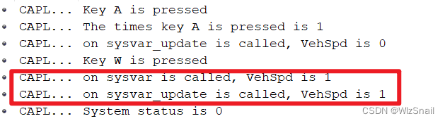 可以发现这一次只有upate被调用了,因为系统变量VehSpd的值没有发生变化,所以on sysvar不会被调用。