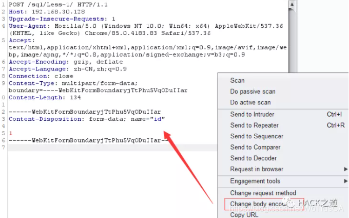 将头部Content-Type改为multipart/form-data; boundary=69 然后设置分割符内的Content-Disposition的name为要传参数的名称。数据部分则放在分割结束符上一行,可以直接使用Burp中的change body encoding来更改数据格式,进行绕过
