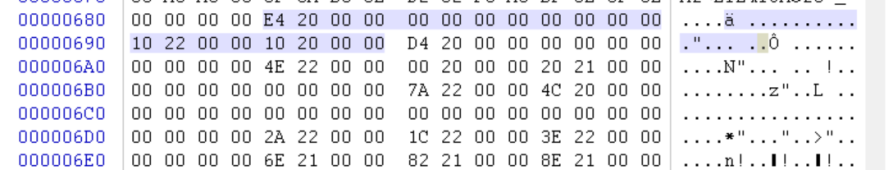 3.第一个字节为桥1的RVA,计算其FOA并跳转得到桥1的数组,每四个字节为一组,到四个字节均为00结束。每一组的FOA跳转得到对应函数。