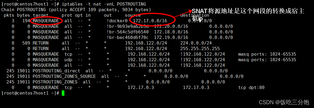 根据路由表得到网卡,根据网卡到达宿主机,在宿主机这里会被iptables利用SNAT(源地址转换)转换成宿主机ip,然后转发到默认网关(宿主机网关),借助宿主机的网络访问互联网。