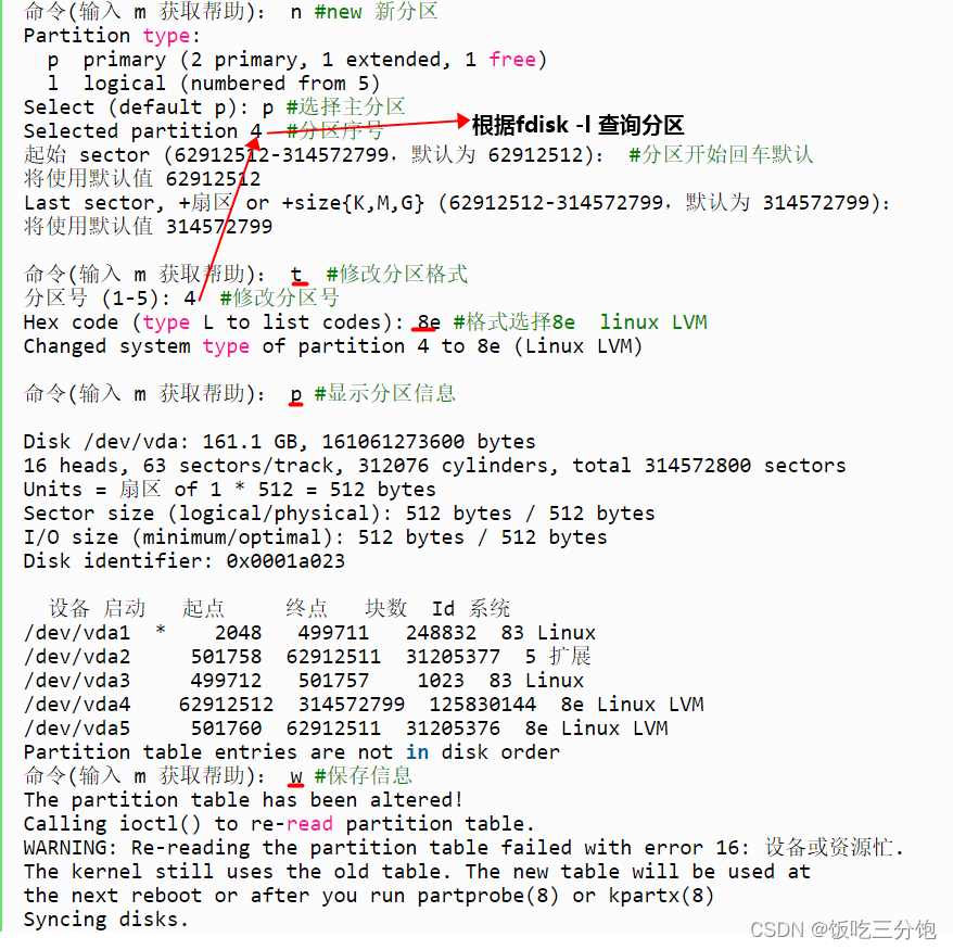 4.使用fdisk /dev/sda(fdisk -l首行显示Disk), 创建新分区 /dev/sda3。(选择分区序号,根据fdisk -l 查询已经存在分区后,再选择自己要创建的新分区)