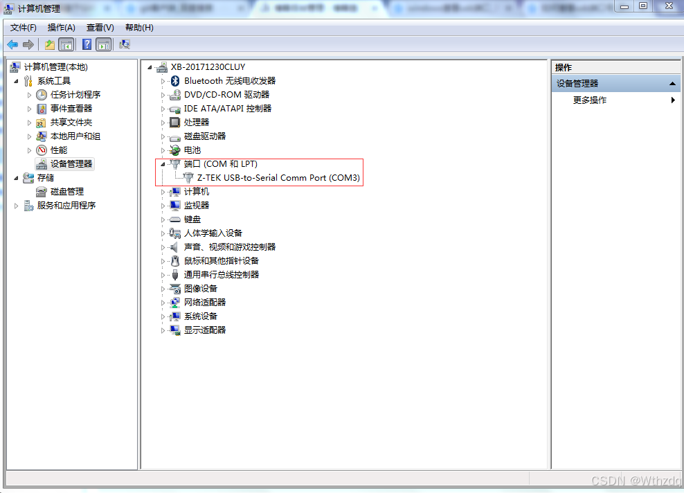 1.右键计算机-->管理-->设备管理,在打开的页面点一下“设备管理器”,在其中点击“端口(COM和LPT)”,可以看到此时连接了console线的端口号。我的端口号为COM3。
