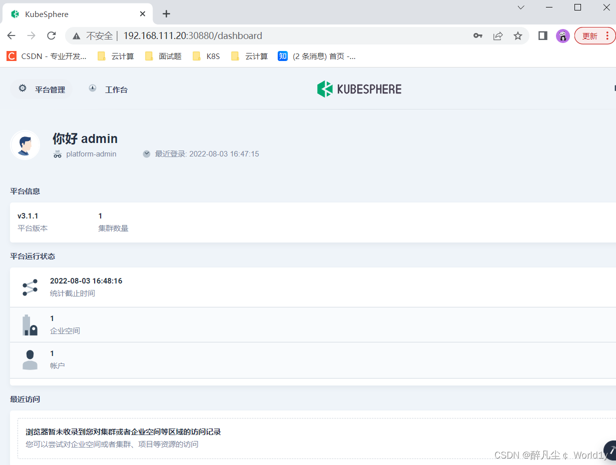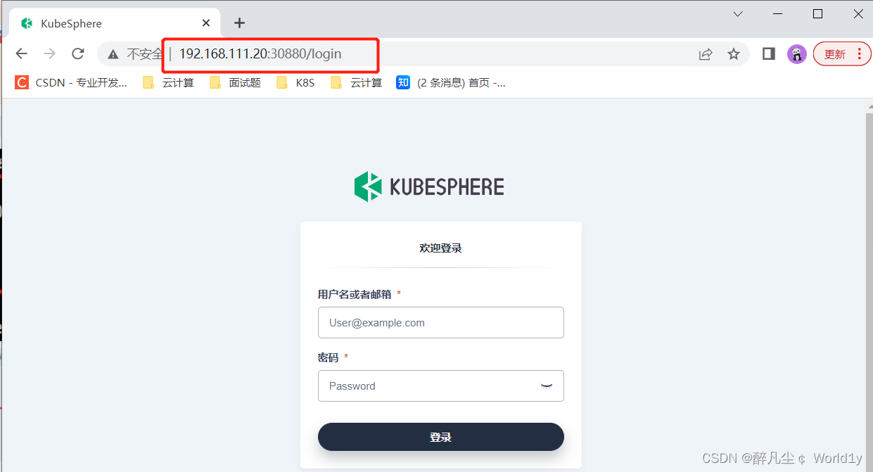在确保KubeSphere的相关插件都Running后,我们就能访问KubeSphere了(KubeSphere默认监听30880端口,如果是公有云环境需要注意安全组开放30880端口):IP:30880
