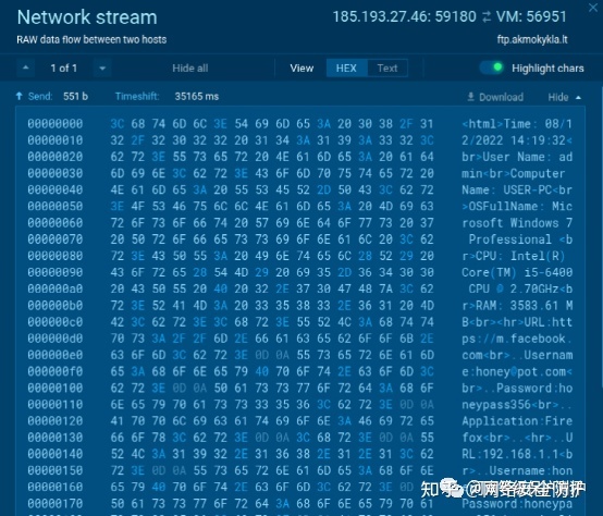 在我们的在线沙盒示例中,我们可能会查看网络流内部,以接收到 C2 的骗子凭据信息以及从受感染机器上窃取的信息。