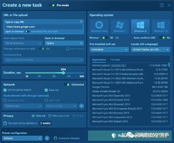可以自定义具有特定要求的 VM,例如浏览器、Microsoft Office、选择操作系统位数和区域设置。添加用于分析的工具并将它们安装在 VM 中:FakeNet、MITM 代理、Tor、VPN。也可以在沙箱中轻松完成,以ANY.RUN为例: