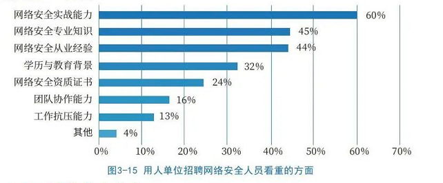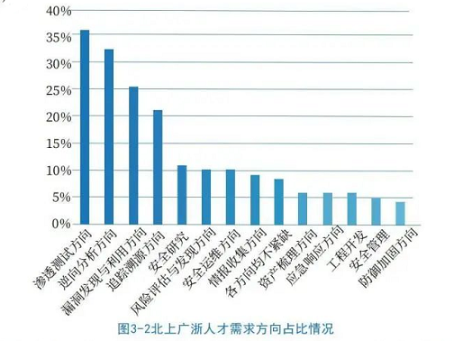 网络安全岗位重点关注安全管理、安全建设、安全运营、测试评估、科研教育五种类型,具备网络安全人才攻防实战能力的人群以安全运营岗与测试评估岗居多。