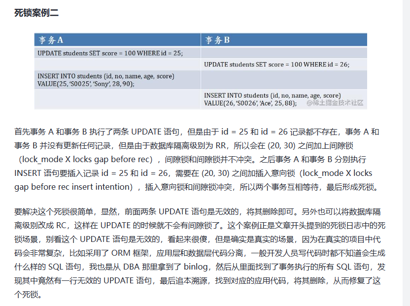 根据上述信息找出两个相互死锁的事务执行的 SQL 操作,根据本系列介绍的锁相关理论知识,进行分析推断死锁原因