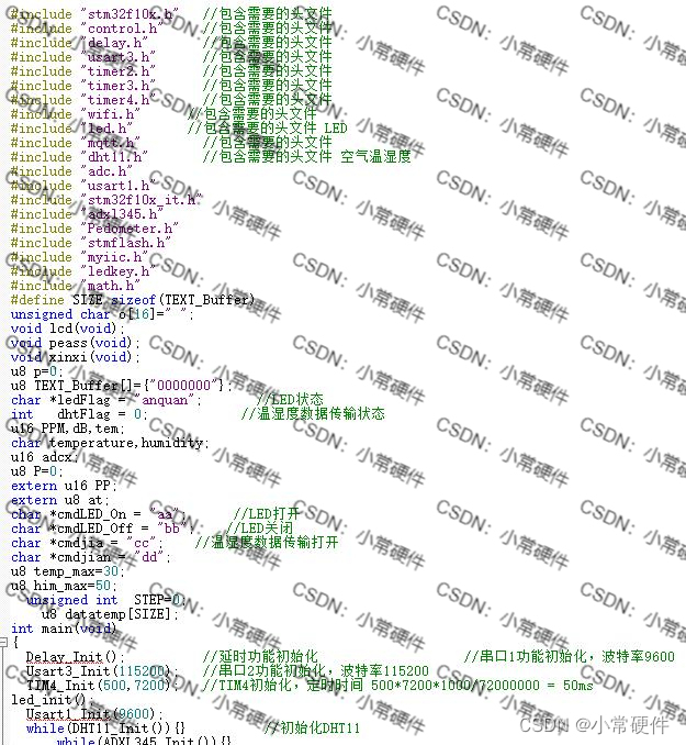 系统内的主要电路有单片机最小系统电路,烟雾浓度检测电路、无线通信电路、DHT11温湿度检测电路,ESP8266无线传输电路、GSM移动通信电路、ADXL345摔倒检测电路。