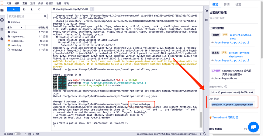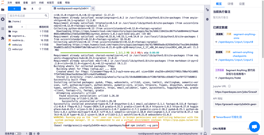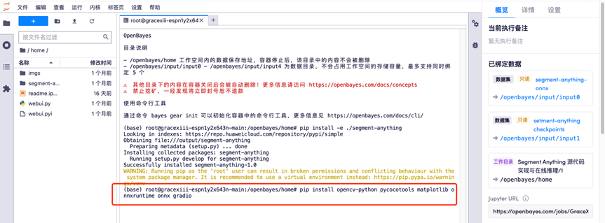 然后运行 pip install opencv-python pycocotools matplotlib onnxruntime onnx gradio 命令安装所需依赖。