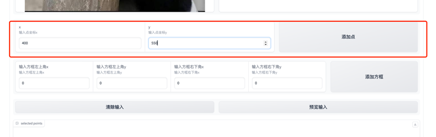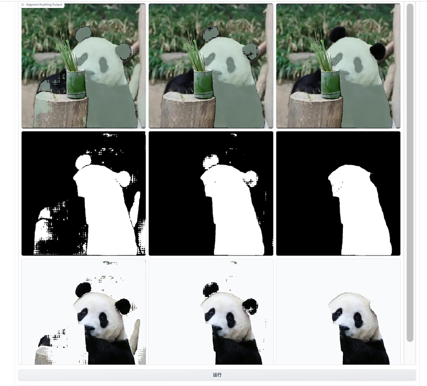 如果我们想要把熊猫给分割出来,可以在下图位置输入点坐标,比如(400,550),(400,250)这两个点分别选中了熊猫的头和身体,我们用这两个点去分割图像,点击「运行」即可。