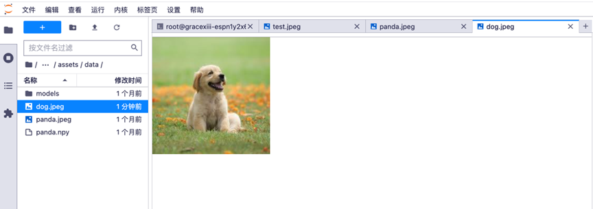然后我们将 README 里的 panda.jpeg 改为 dog.jpeg,图片的名称也改为 dog。使用 Shift+Enter 运行这段代码。