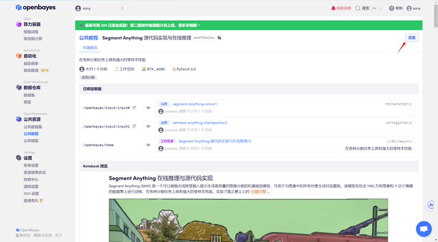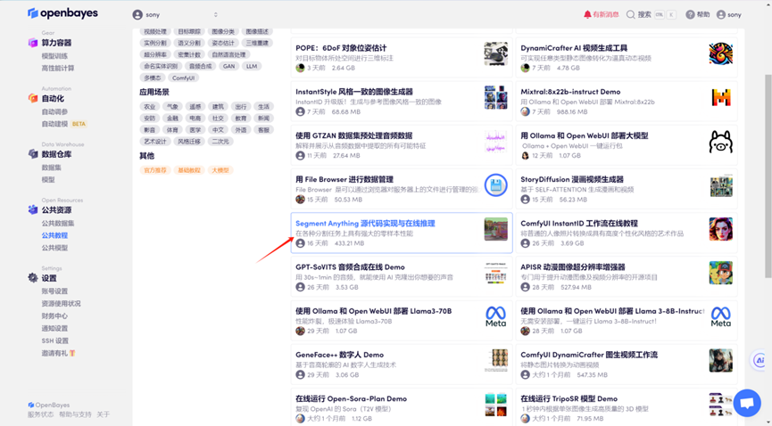 首先登录「OpenBayes」平台,打开「公共教程」,找到「Segment Anything 源代码实现与在线推理」教程。