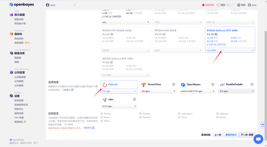 选择一块 RTX 4090 的算力和 PyTorch 的镜像。