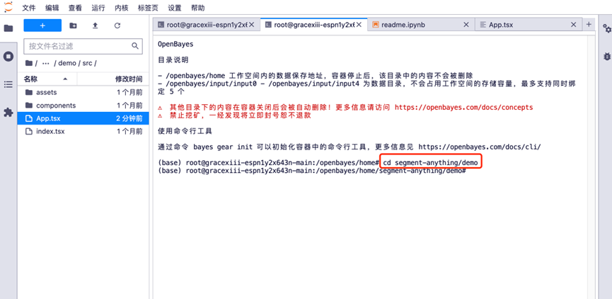 之后切换工作目录,新建一个终端,使用 cd segment-anything/demo 命令将目录切换到我们的 demo 目录下。