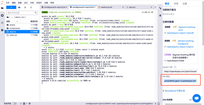 然后我们返回到 segment-anything/demo/src 目录,找到 App.tsx, IMAGE_PATH 为复制进目录的图片,IMAGE_EMBEDDING 为上一行生成的 <image_name>.npy,把名字改为输入的名字即可,MODEL_DIR 切换为使用的模型名称即可。