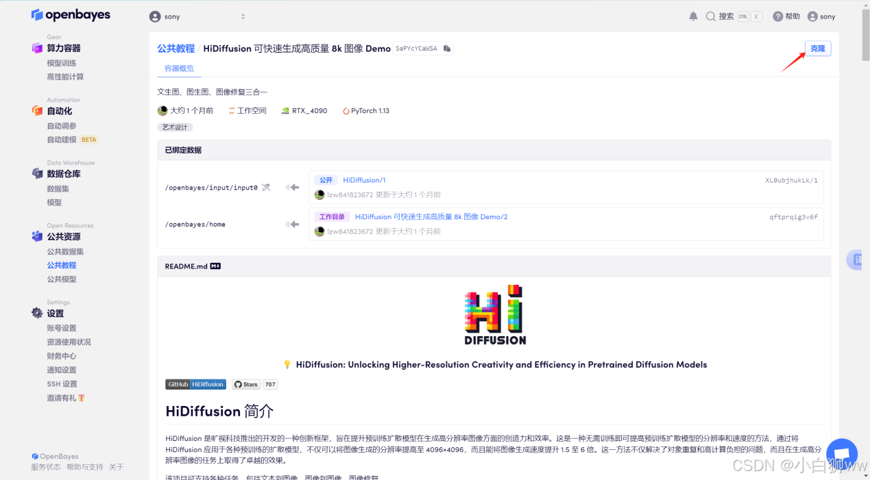 登录到 OpenBayes 平台后,打开「公共教程」,找到「HiDiffusion 可快速生成高质量 8k 图像 Demo」的教程。