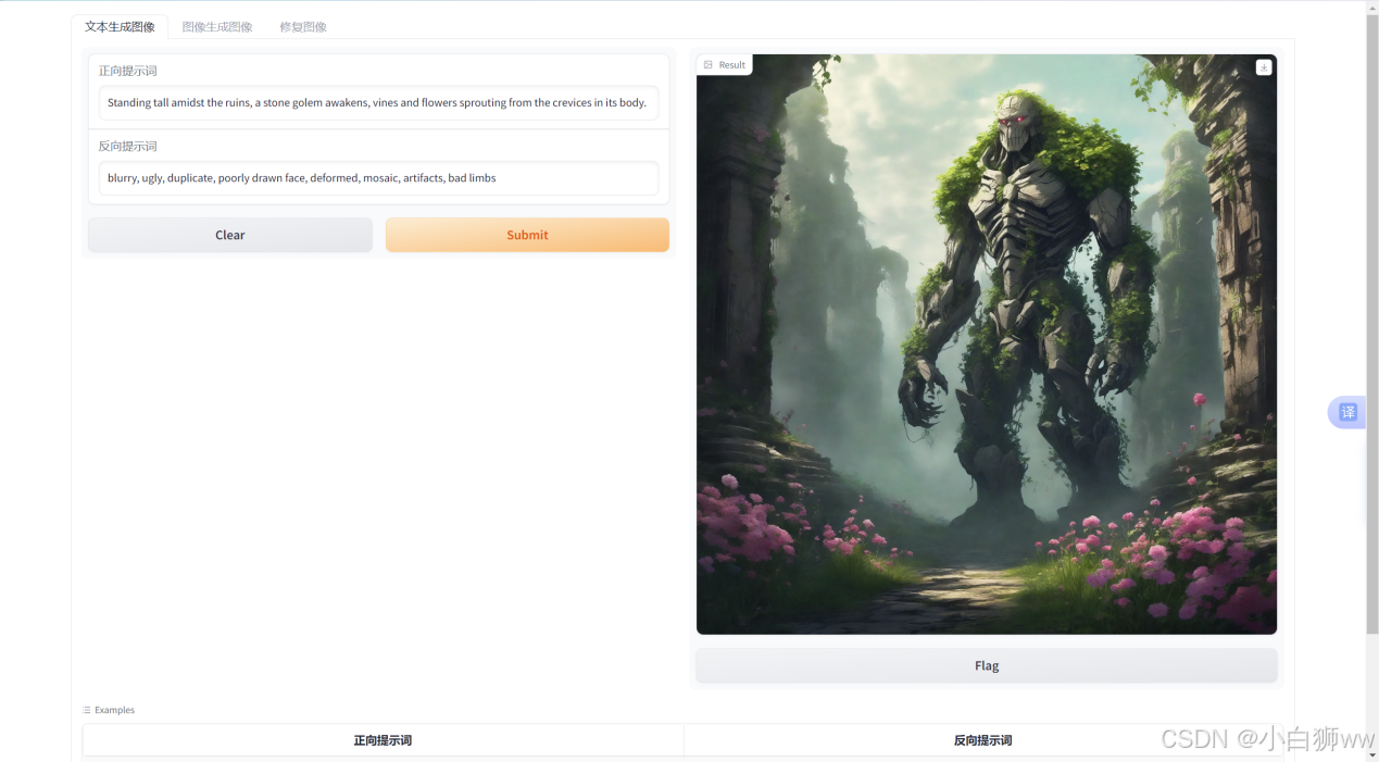 其中正向提示词为:Standing tall amidst the ruins,a stone golem awakens,vines and flowers sprouting from the crevices in its body