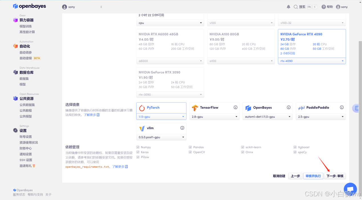 推荐选择 RTX 4090,别忘了使用文章开头的邀请链接,get 免费时长!选择好后,点击「下一步:审核」即可。