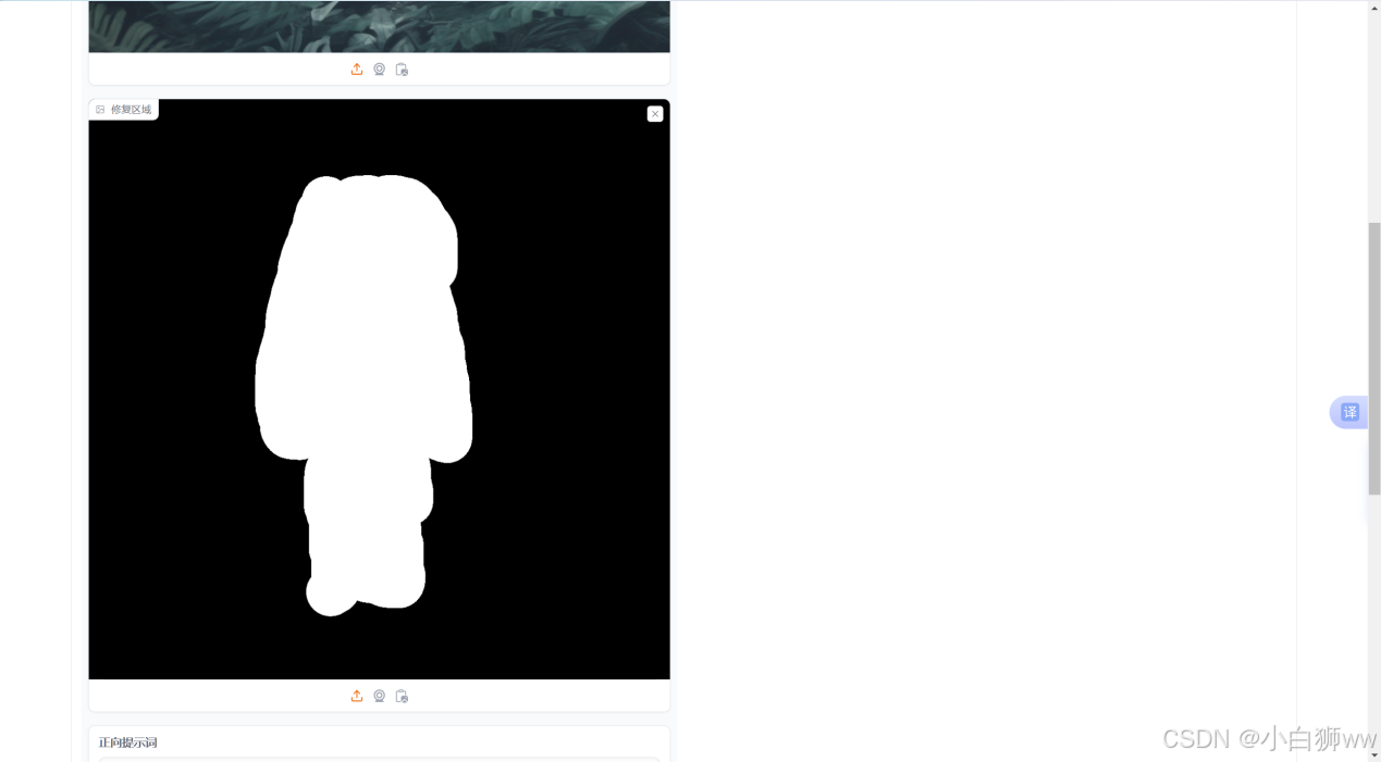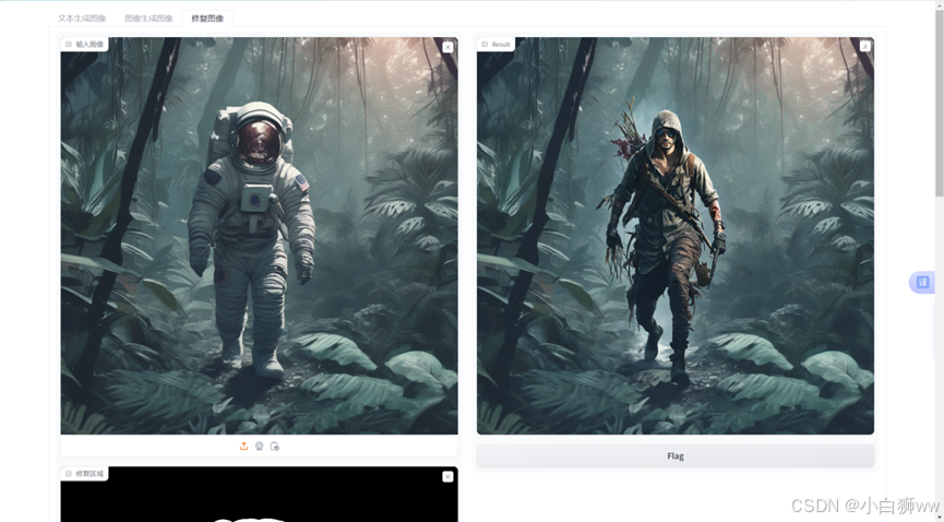 首先上传一张需要修复的图像以及一张修复位置标记图,修复区域中的黑色区域是冻结的区域,表示我们不需要进行修改的区域,白色区域为需要修改的区域。
