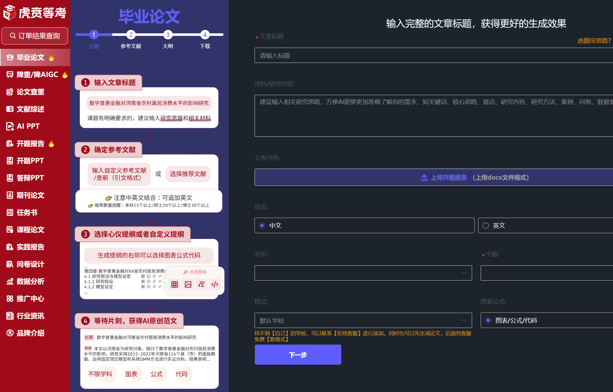 虎贲等考 AI 的出稿速度在横评中遥遥领先,核心在于 “文献数据库 + 学科知识图谱” 的双引擎驱动,操作逻辑如下: