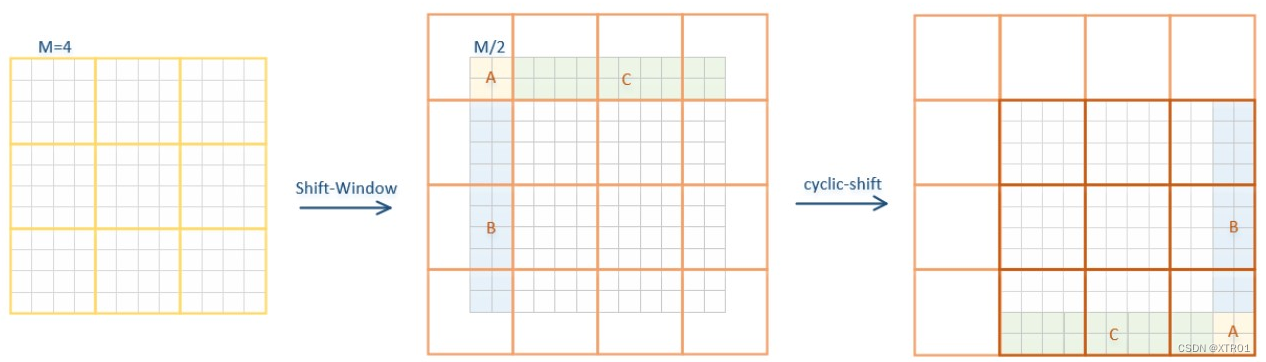 解决的方法是将较小的窗口填充到M×M的大小,并在计算注意力时屏蔽填充值。将左上方小块循环移位填充到右下方,如上图。在这个移位之后,某些窗口内可能由几个在特征图中不相邻的子窗口组成,因此使用掩蔽机制将自注意计算限制在每个子窗口内(这个子窗口是指被移动的不同颜色的小块构成的,这些有颜色的部分会被遮盖)。通过循环移位,窗口的数量与常规窗口分区的数量相同。