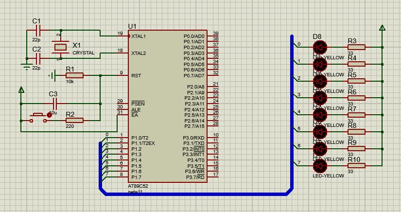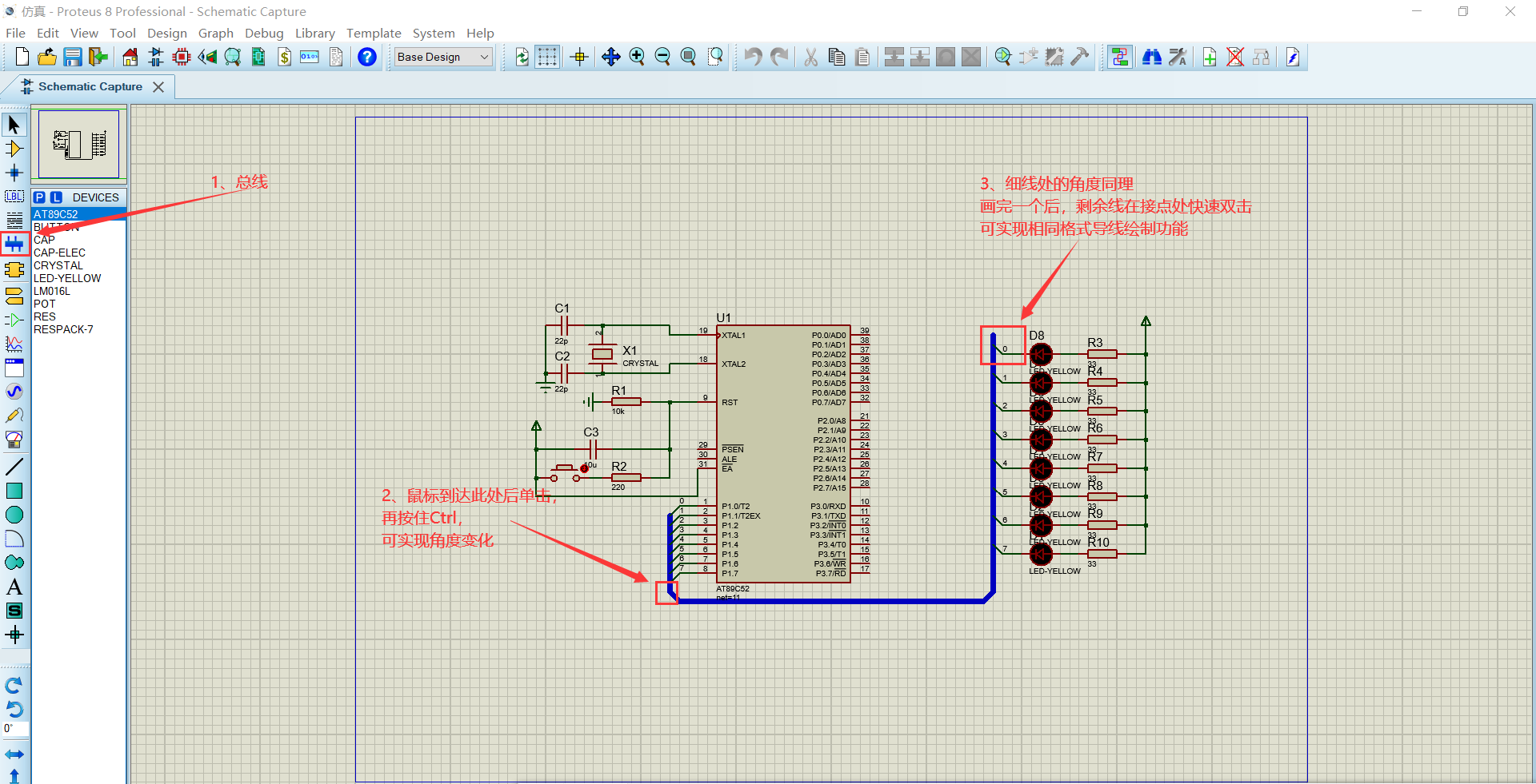 【51单片机】外部中断(附源码) 要求:用STC89C51单片机,按键,LED灯完成外部中断实验。程序中点亮LED流水灯,当按键按下时,外部中断触发,程序转至中断服务程序,在中断服务程序中使LED灯全亮;按键松开时,从中断服务程序转至主程序,继续点亮流水灯。电路原理图如下:理解单片机的外部中断不是以在主函数中调用为信号,而是操作者外部对它的做法为信号. 51有两个中断口,分别为P3^1,P3^2.各自对应按键K1和K2,可以在其中选一个做中断源,需要注意,中断0对应中断号0,中断1对应中断号2,这里选择中断0.
