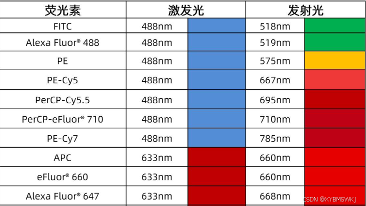 4. PE-Cy5:PE-Cy5是一种复合染料,属于藻红蛋白偶联物,在此类复合染料中,激发能量可从PE传递到Cy5上,最大发射波长为667 nm。由于PE-Cy5与FITC、PE在光谱上重叠范围较少,荧光干扰少,因此实验中常将PE-Cy5与FITC、PE搭配使用。需注意,PE-Cy5不适合与APC搭配使用,两者荧光重叠大。