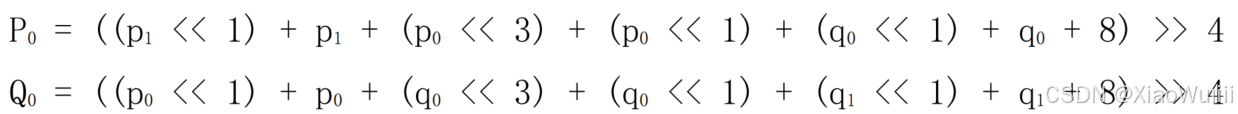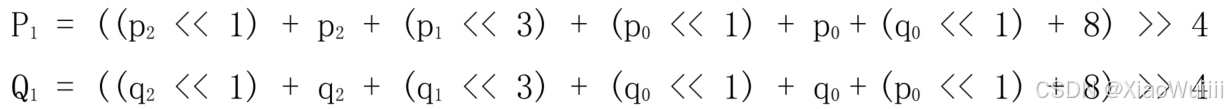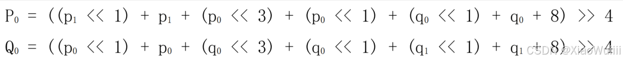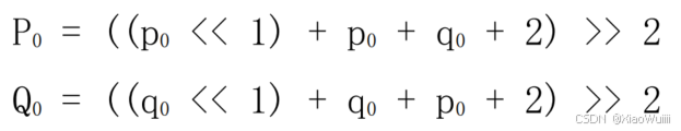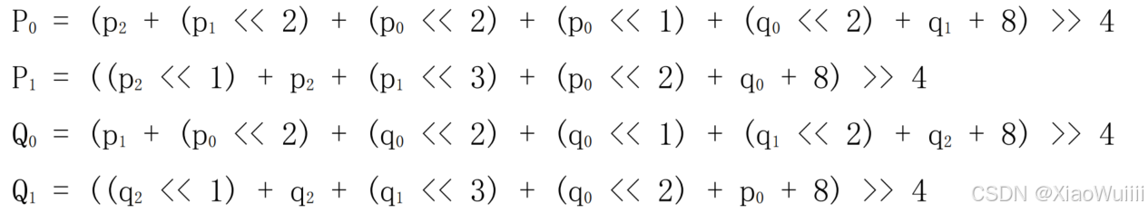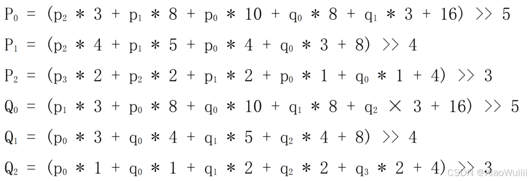 ①当fs等于6时,如果 Abs(po-p1) <= β/4且Abs(q-q1) <= β/4且Abs(po-q0) < α,则Bs = 4;否则 Bs = 3。