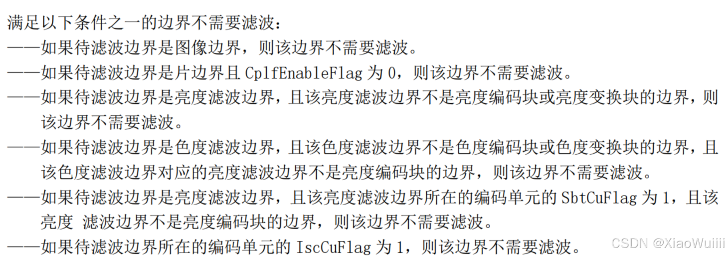 2. 每个滤波块包括一条垂直边界和一条水平边界。亮度滤波块的每条边界的长度为8个亮度样本,平均分为8段。色度滤波块的每条边界的长度是8个色度样本,平均分为8段。对每个滤波块,首先滤波垂直边界,然后滤波水平边界,其中先亮度再色度。