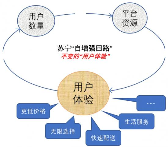 苏宁易购总裁侯恩龙在总结和公开苏宁10年布局逻辑“场景零售”时称,“我们一直深耕场景布局,坚持从用户的需求出发,心无旁骛回归零售的本质,始终聚焦场景布局,从未偏离”,从“自增强回路”商业逻辑来看,苏宁的确一直未变,也只有不改变以用户体验为起点的闭环逻辑,其优势才能一直保持。