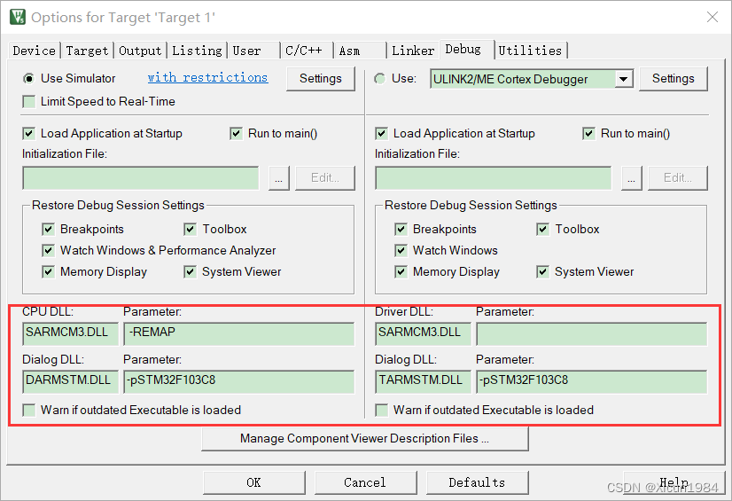 设置Debug选项下面的“Dialog DLL"和"TARMSTM.DLL";parameter项改为“-pSTM32F103C8",用于设置支持STM32F103C8的软硬件仿真,点击ok