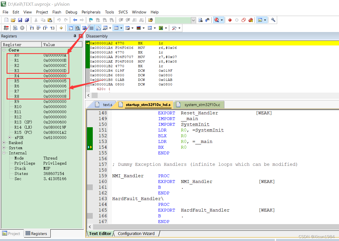 按照要求进行单步运行,发现寄存器 R5,R6,R7,R8 的值和程序设置一致: