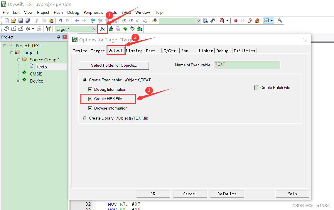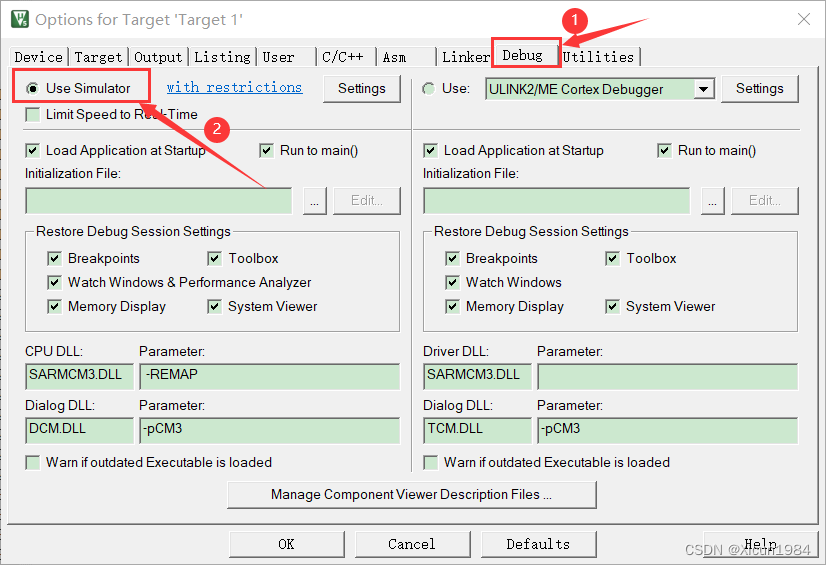 先进行一些初始设置,点击 Options for Target…, 在Output界面下,勾选 Create HEX File,才能生成 hex 文件;在 Debug界面下,勾选 Use Simulator,因为在后面我们要进行虚拟调试,后OK 保存设置。