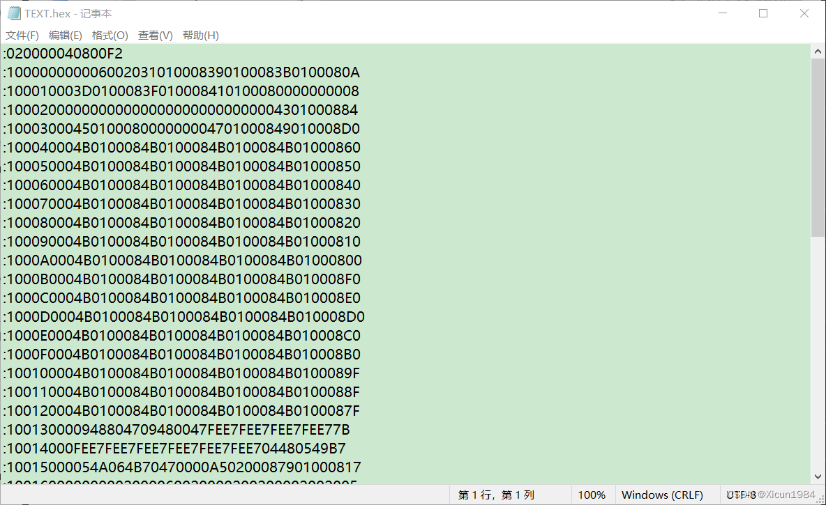 用记事本打开生成的hex文件,是一串十六进制字符。