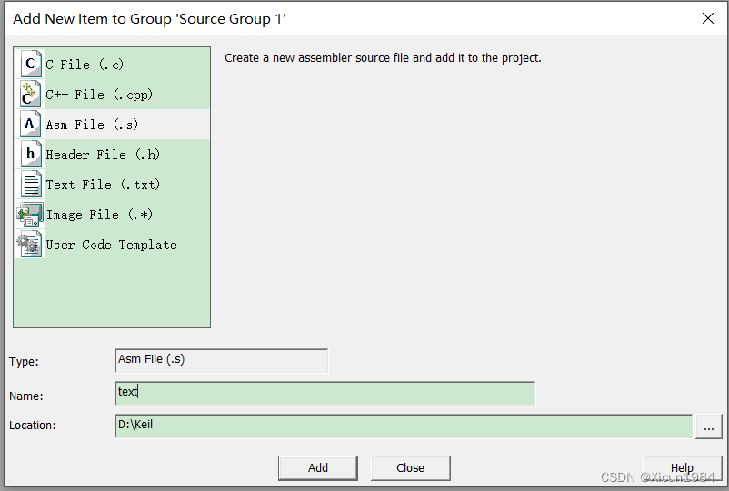 选择文件类型,这里我们点击 Asm Files (.s) 添加汇编文件,然后输入文件名text,并点击 Add。