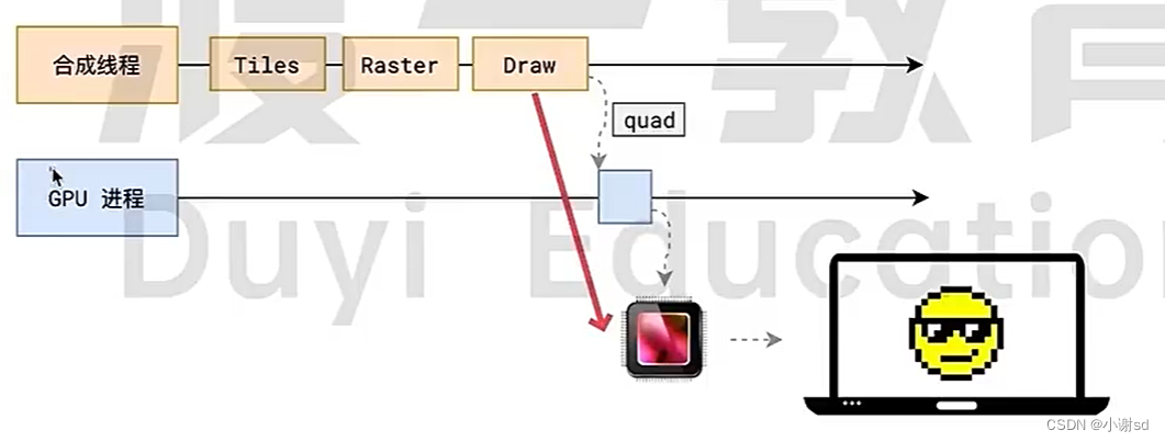 合成线程会把 quad 提交给GPU进程,由GPU进程产生系统调用,提交给GPU硬件,完成最终的屏幕成像。