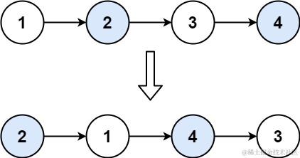给你一个链表,两两交换其中相邻的节点,并返回交换后链表的头节点。你必须在不修改节点内部的值的情况下完成本题(即,只能进行节点交换)。