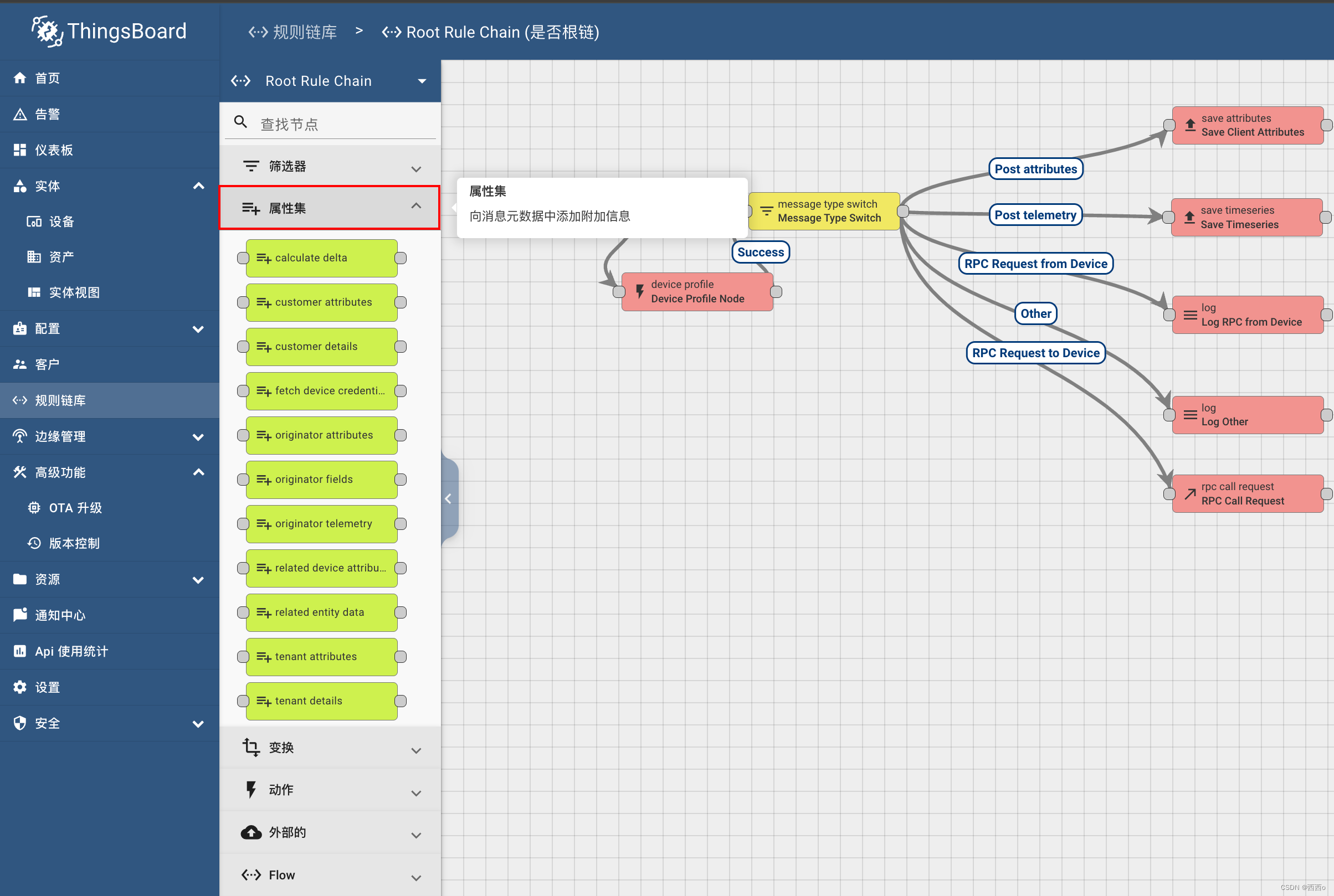 属性集节点专注于设备或资产的属性管理。它可以用于提取、更新或删除设备的静态属性,如设备位置、状态或配置信息。利用此节点,您可以轻松地在规则链中集成属性的变更逻辑,比如基于设备新位置的属性更新后触发特定的响应动作,进而实现动态配置或个性化服务。