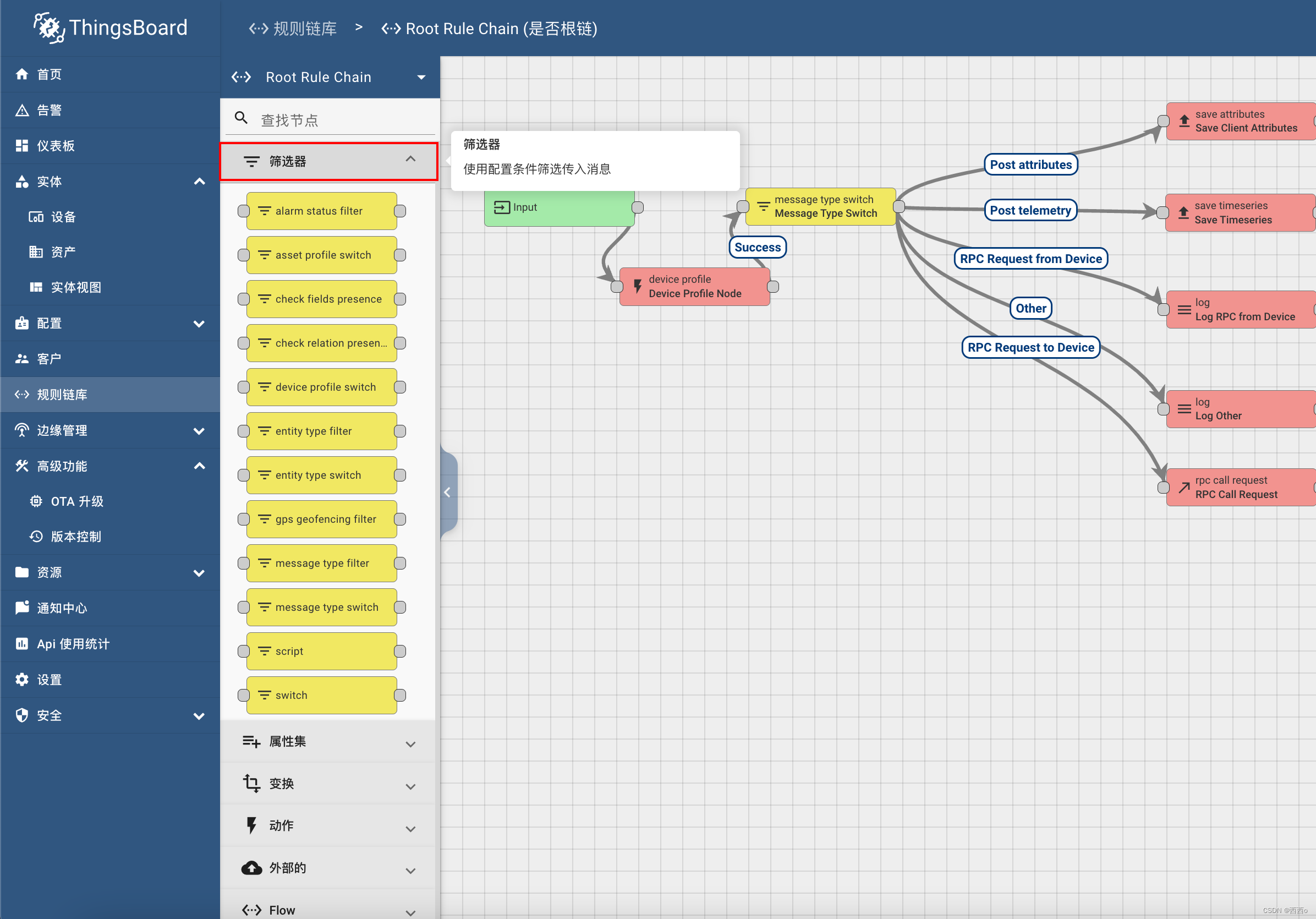 筛选器节点是规则链的守门人,负责依据预定义条件对消息进行筛选。它允许您根据设备属性、遥测数据、时间戳等信息设置条件,仅让满足条件的消息继续通过规则链。例如,您可设置一个筛选器来监控设备温度,仅当温度超过某个阈值时才触发后续动作,从而避免资源浪费,提高系统响应的针对性。