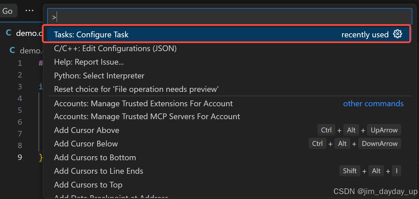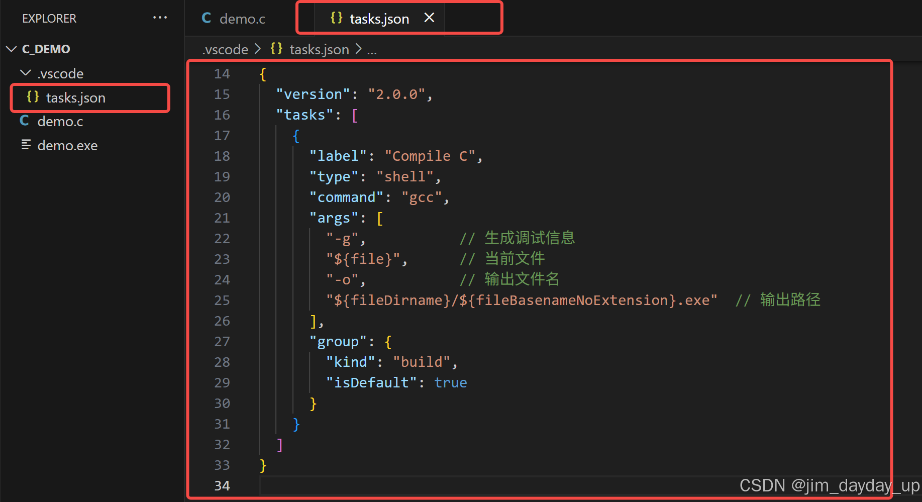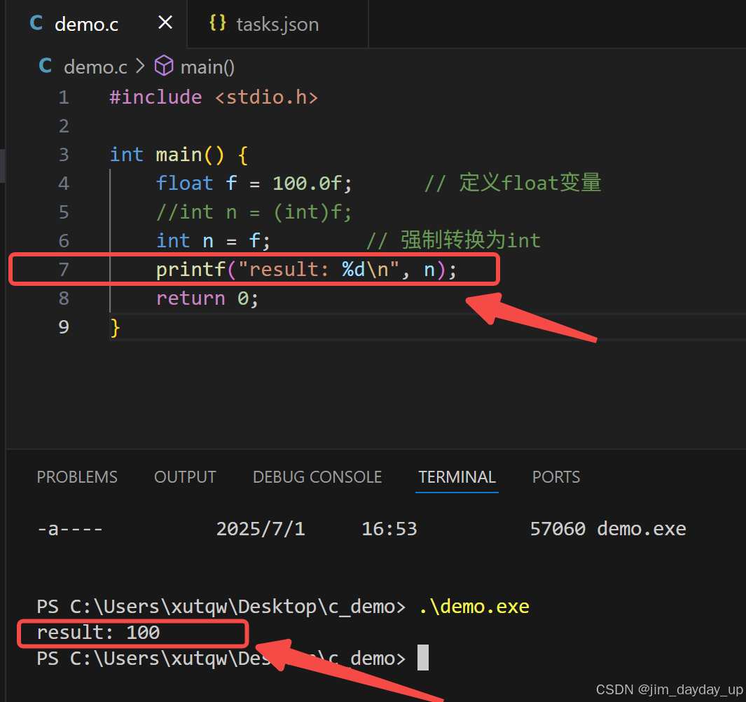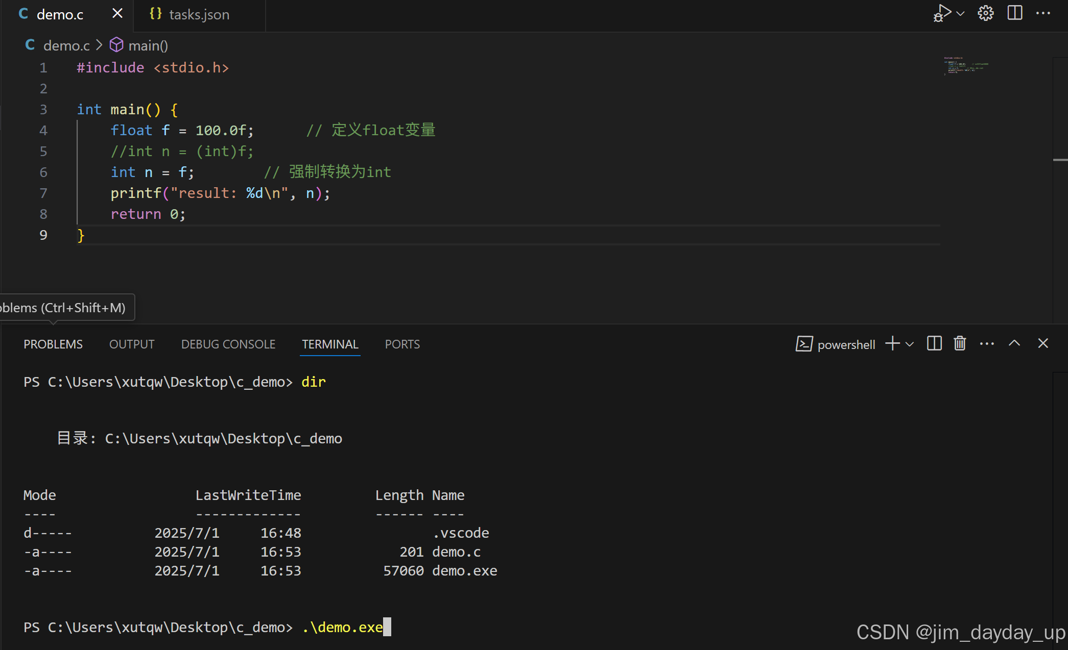 按 Ctrl+Shift+B 执行编译任务,生成 demo.exe(Windows)或 demo(macOS/Linux)