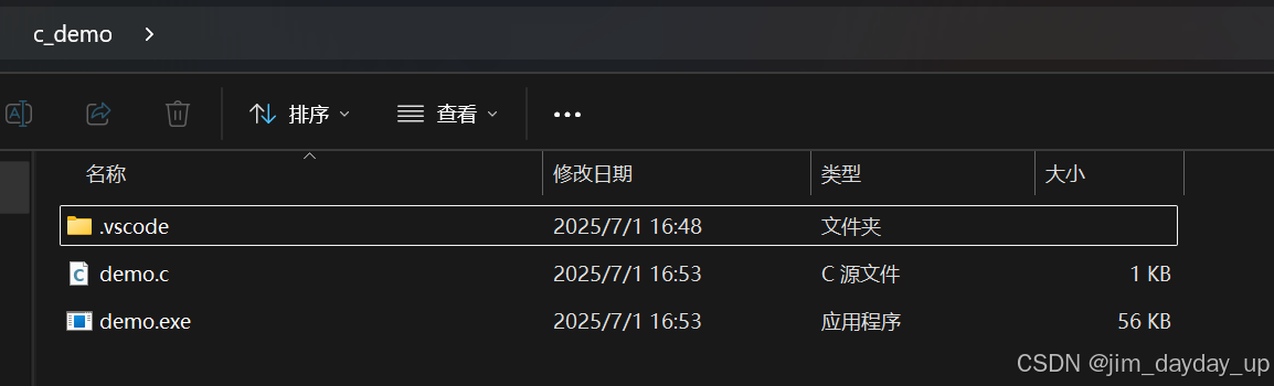 创建工作目录,如下图的c_demo,exe文件是后生成的。