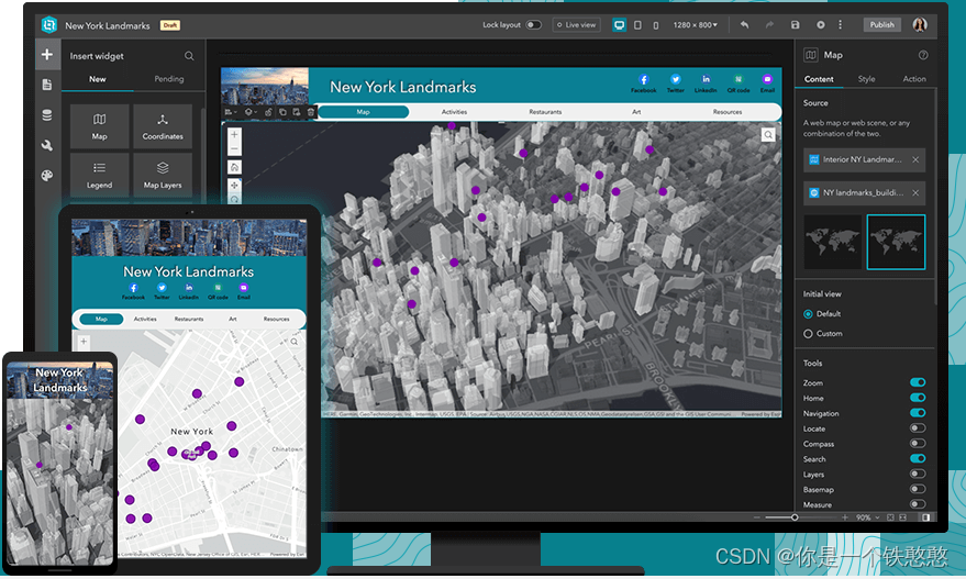 ArcGIS ExperienceBuilder开发版部署及应用构建 ExperienceBuilder(简称:EXB)是以无代码或低代码方式创建web应用程序的平台,通过自定义灵活的布局、内容、微件与2D、3D数据交互,可适配不同屏幕尺寸。