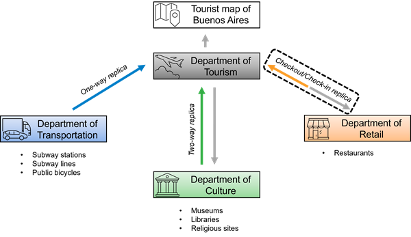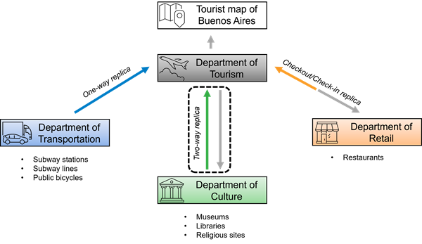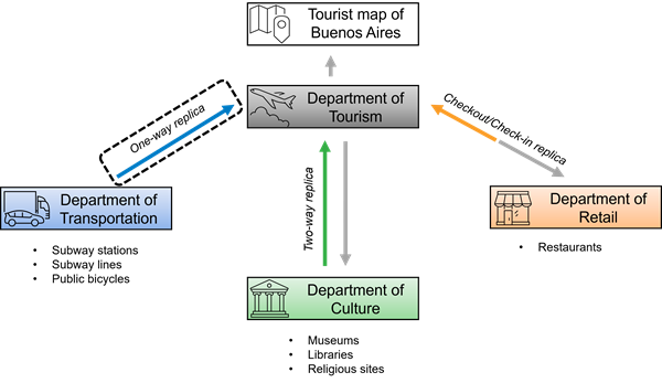 2、使用双向副本分发数据 双向复制可用于多次将数据变更从父复本发送到子复本,反之亦然。 如果在两个复本地理数据库中编辑相同的数据,则在复本同步期间将会检测到冲突。 可以自动解决冲突以支持复本地理数据库,也可以使用版本化手动检查冲突。