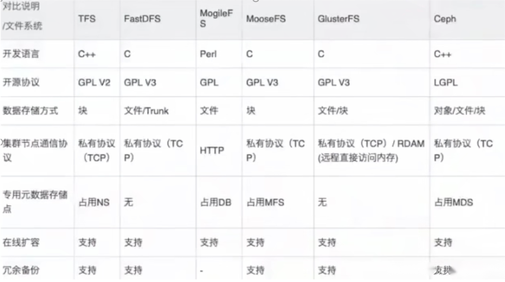 Ceph、TFS、FastDFS、MooseFS(MFS)、HDFS、GlusterFS(GFS)