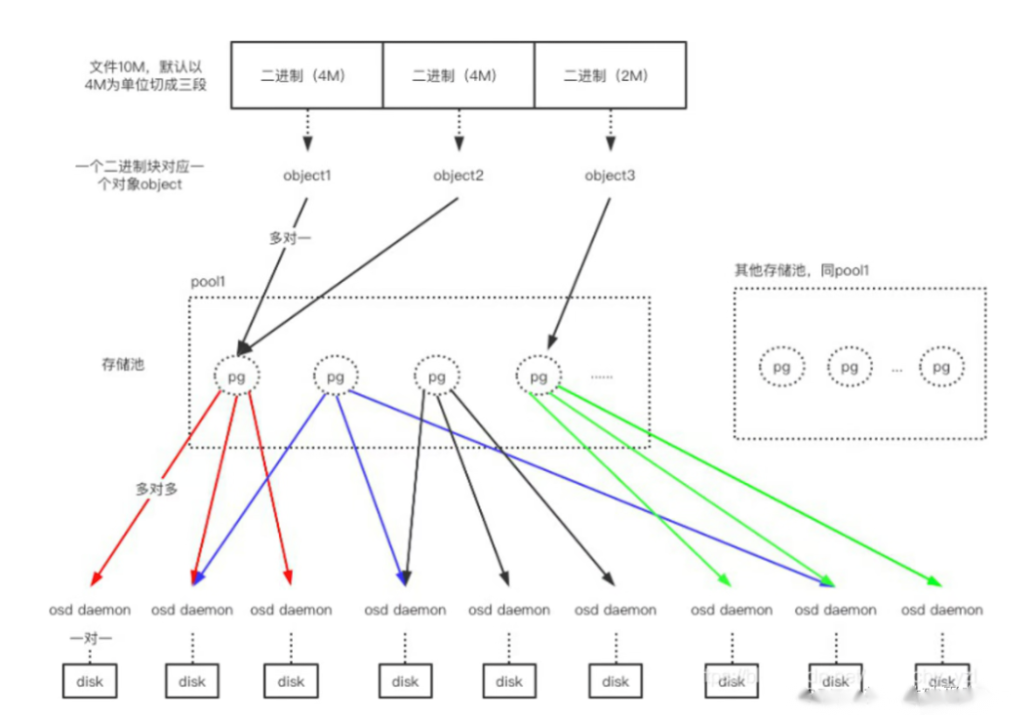 Pool、PG 和 OSD 的关系: 一个Pool里有很多个PG;一个PG里包含一堆对象,一个对象只能属于一个PG;PG有主从之分,一个PG分布在不同的OSD上(针对多副本类型)
