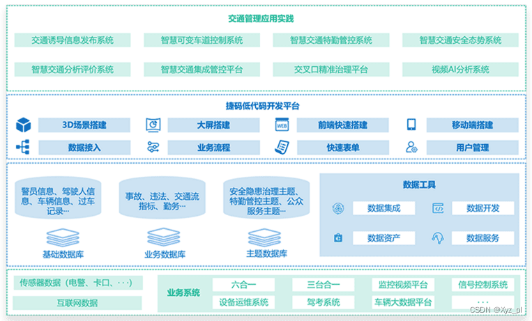 智慧交通解决方案采用“2大低码基座+应用实践”体系,面向丰富的业务应用场景需求提供数据应用解决方案。